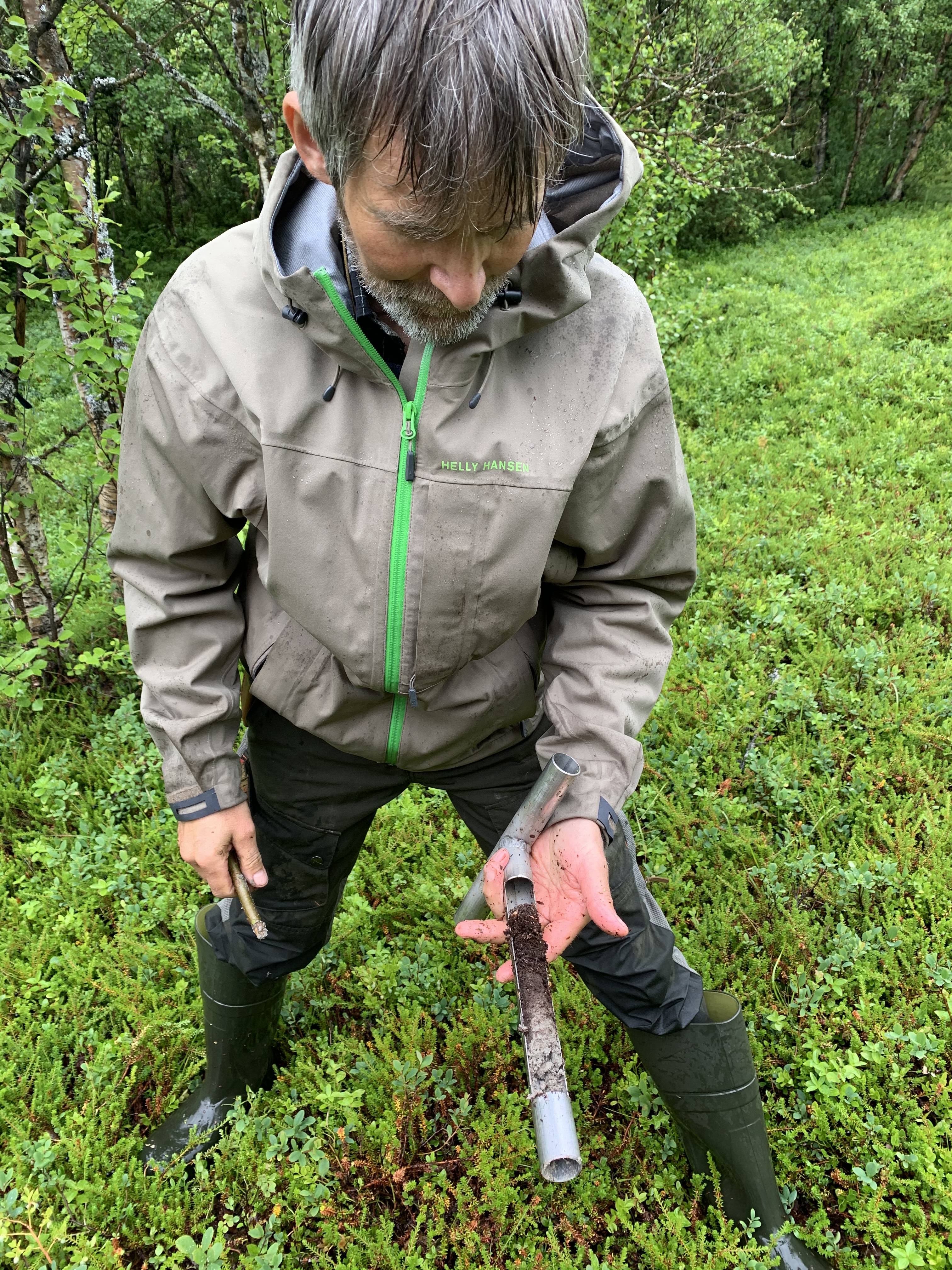 Vi ser på jorda under kreklingdekker som vi antar har etablert seg i nyere tid – her i utmarka til Peter Bruvold i Lyngen – og påfallende ofte finner vi tykt jordlag.